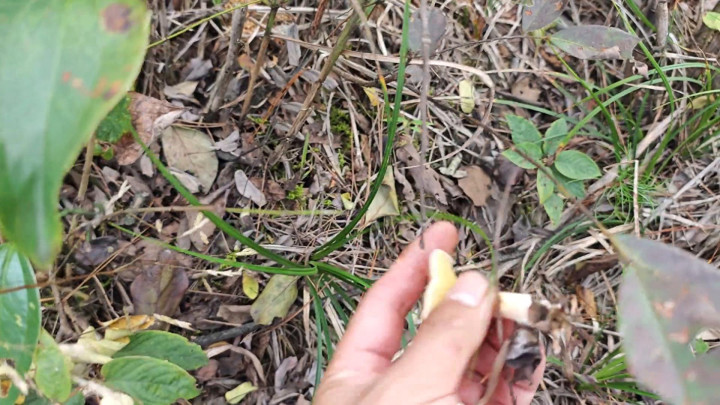 今天在野外找蘑菇,好多都不认识,好多蘑菇都不认识,不知道能不能吃,不知道有没有毒。但是在蘑菇的旁边看到一个什么?看一下,这个就是野生的柿子,快要熟了,看到没有?这个是不是熟了?快熟了。