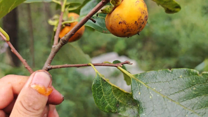 这个季节如果到大别山去了,到这种山上,野生的果子说实话真的是非常多的,非常非常多。前提就像找蘑菇一样,得认识,这个就是野生野生的柿子。